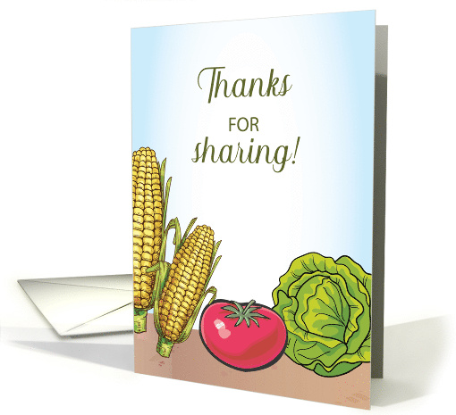Thank the gardener who has shared the bounty of their vegetables with you. A light blue background is behind the vegetables of broccoli, tomato and lettuce. This card is perfect for thanking someone for sharing their produce of any kind!