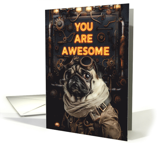 A pug dog scientist wearing goggles in front of their latest invention, a machine with gears, tubes and stuff that lights up and the text 'You are awesome'. A great card to send to your steampunk loving friend to let them know how awesome they are.