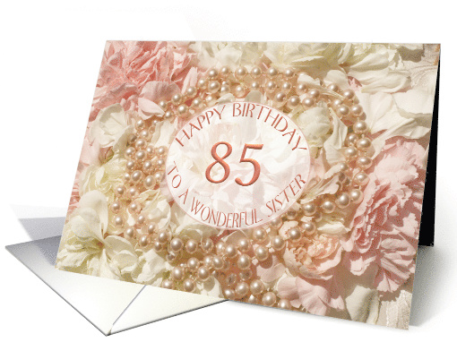 85th birthday greetings or sister with pearls and petals. A beautiful way to wish a happy birthday. Pink pearls lie an a bed of pink and white petals. A very feminine card for a woman.