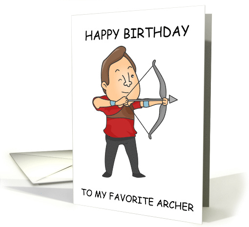 A cartoon of a male archer with bow and arrow, one eye shut in concentration The words 'Happy BIrthday to my favorite archer' accompany the image.