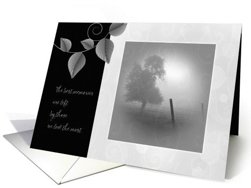 Share heartfelt sympathy with this beautiful faint photograph of a tree by a fence with the sun burning through the fog and the words "The best memories are left by those we love the most." Original photograph and design by Sue Nollmeyer 10714