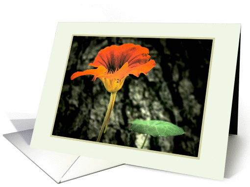 Bright orange Nasturtium flower with green leaf against dark background photography blank sympathy card by ZenzCards