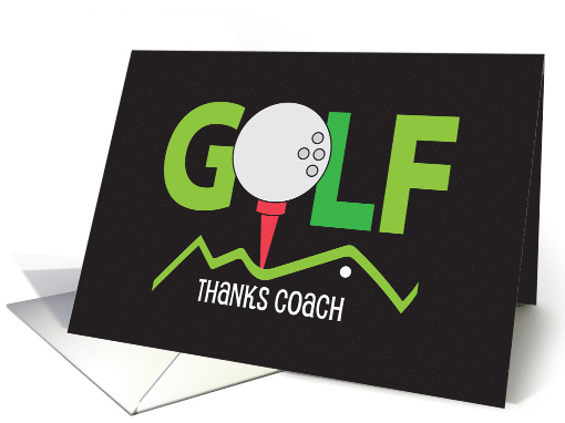 "Thanks Coach" is the white wording that fills the bottom of this dynamic thank you card for your golf coach, your child's golf coach or the golfing pro who helps your game at your golf club. The large word "GOLF" jumps out of the card, in bright green letters, with a white golf ball, dimpled with tiny round indentations, sits on a red tee waiting for the golf game to start with a magnificent drive. A wavy green line duplicates the rises and hills of a golf course, with a round ball at the crest of one hill. The card's inside wording is blank so you can make the wording appropriate to the situation, whether thanking the coach for help with a tournament, for a wonderful year of their golf coaching or their assistance with a special project. Who the card is being sent by can also be personalized, as you type your own wording inside, while ordering.
