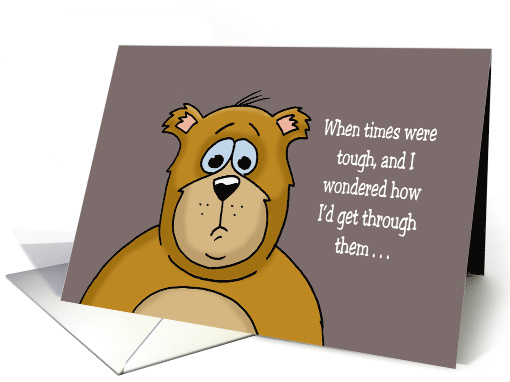 Thank you card for a friend. The front shows a serious looking cartoon bear, and the words: When times were tough, and I wondered how I'd get through them ... Inside says: ... it was because I had a friend like you! Thank You