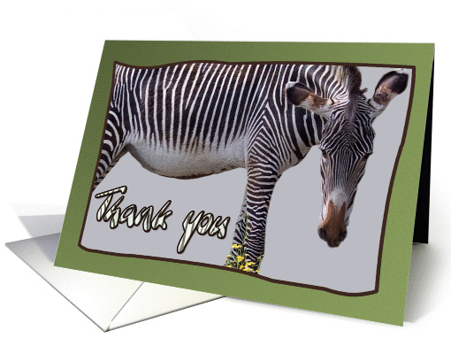 Zebra close-up with zebra print 'Thank you' text on green background - blank inside - makes a great Thank you note card useful for many occasions