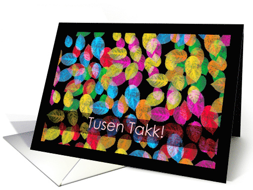 Tusen Takk! Thank You greeting card written in Norwegian. Colored leaves are scattered across the cover of the card in shades of cool and warm colors.
