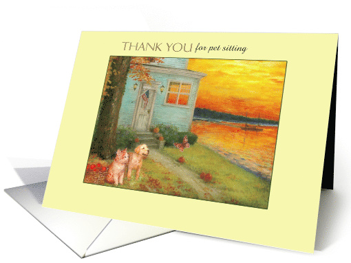 Illustrated thank you greeting for your pet sitter, picturesque Fall watercolor with a cozy pair of kitten & puppy infront of lakehouse with flag gives a sense of home, original cottage by the lake by judith cheng, change the text to fit your custom thanks
