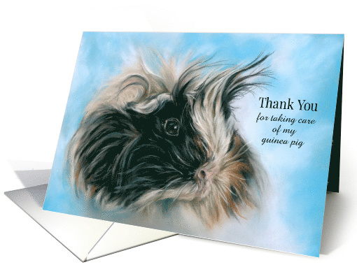 Create a customized thanks for your pet sitter’s services with this card featuring the portrait in soft pastel colors of a charming little guinea pig, or cavy, with wildly windblown looking hair in black, white and red colors.