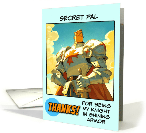 A knight in shining armor with his hand on his broad sword and the text "Secret Pal Thanks! for being my knight in shining armor" A fun design you can sent to your wonderful secret pal to show your appreciation and thanks.