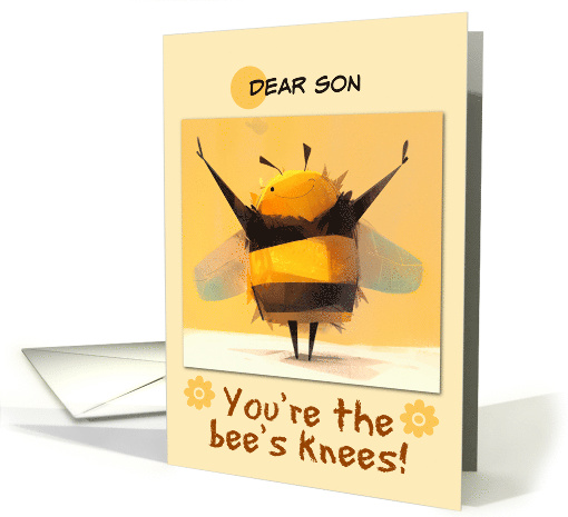 Artist Notes: This charming thank you card features a delightful, cartoonish bee as its centerpiece. The bee is illustrated in a whimsical style with a big smile, round body striped in yellow and black, and tiny legs. Its wings are depicted as light blue and translucent. The bee appears to be doing a happy dance with its arms raised high. The background is a warm yellow color, creating a cheerful and sunny atmosphere. Small yellow flower icons decorate the corners of the card, enhancing the springtime, nature-themed feel. At the bottom of the card, the phrase "You're the bee's knees!" is written in a playful, hand-drawn style font. A sweet design to express your gratitude to someone.