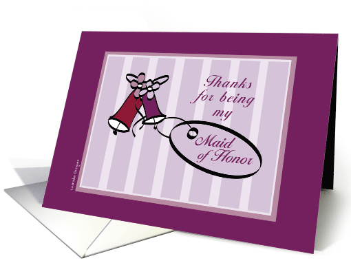 Thanks for being my Maid of Honor card in purple with stripes and wedding bells and flower details.