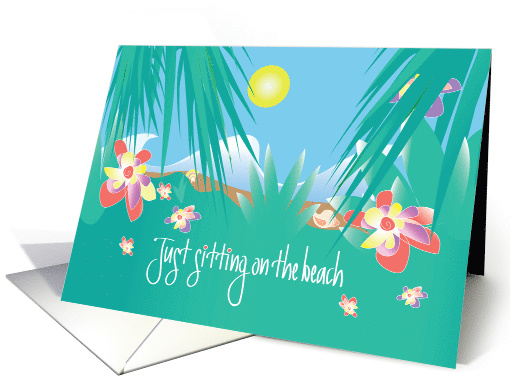 This is a fun card to take along with you on a beach trip and send back to your friends and family from your vacation spot along the beach to let them know you are thinking of them. The card's message, "Just sitting on the beach", in white hand lettering, is placed on a background of colorful tropical flowers and lush green plants, against a background of a seashell strewn beach and ocean waves.
